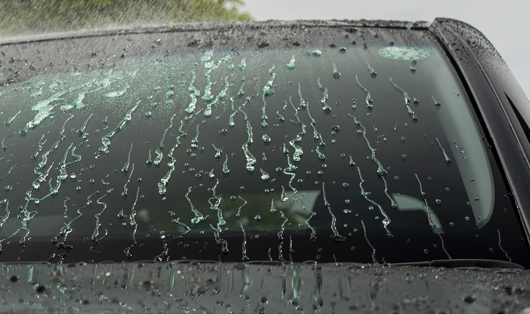 ご覧のような、驚異的な水ハジキ。降りかかる雨は瞬時にピンピンの水玉となり、滑るようにフロントガラスへの風圧で吹き飛ばされます。ノーワイパー走行可能速度はなんと約45km/hから。市街地走行時でも雨をはじいてクリアな視界が得られます。
