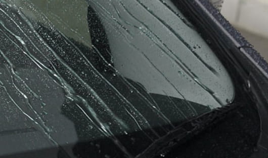 水ハジキ効果がなんと1年間持続します。ご覧の通り素晴らしい水ハジキです。降りかかる雨は、瞬時にピンピンの水玉となり、フロントガラスへの風圧で吹き飛ばされます。 ノーワイパー走行可能速度は約60km/h。